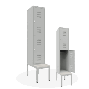 Unsere robusten Stahlblech-Spinde sind in vielseitigen Ausführungen erhältlich. Sie haben die Wahl zwischen verschiedenen Unterbauten – Stollenfüße, ein Sockel oder ein Untergestell mit integrierter Sitzbank. Auch die Innenaufteilung ist flexibel, von einzelnen bis zu doppelstöckigen Abteilen.